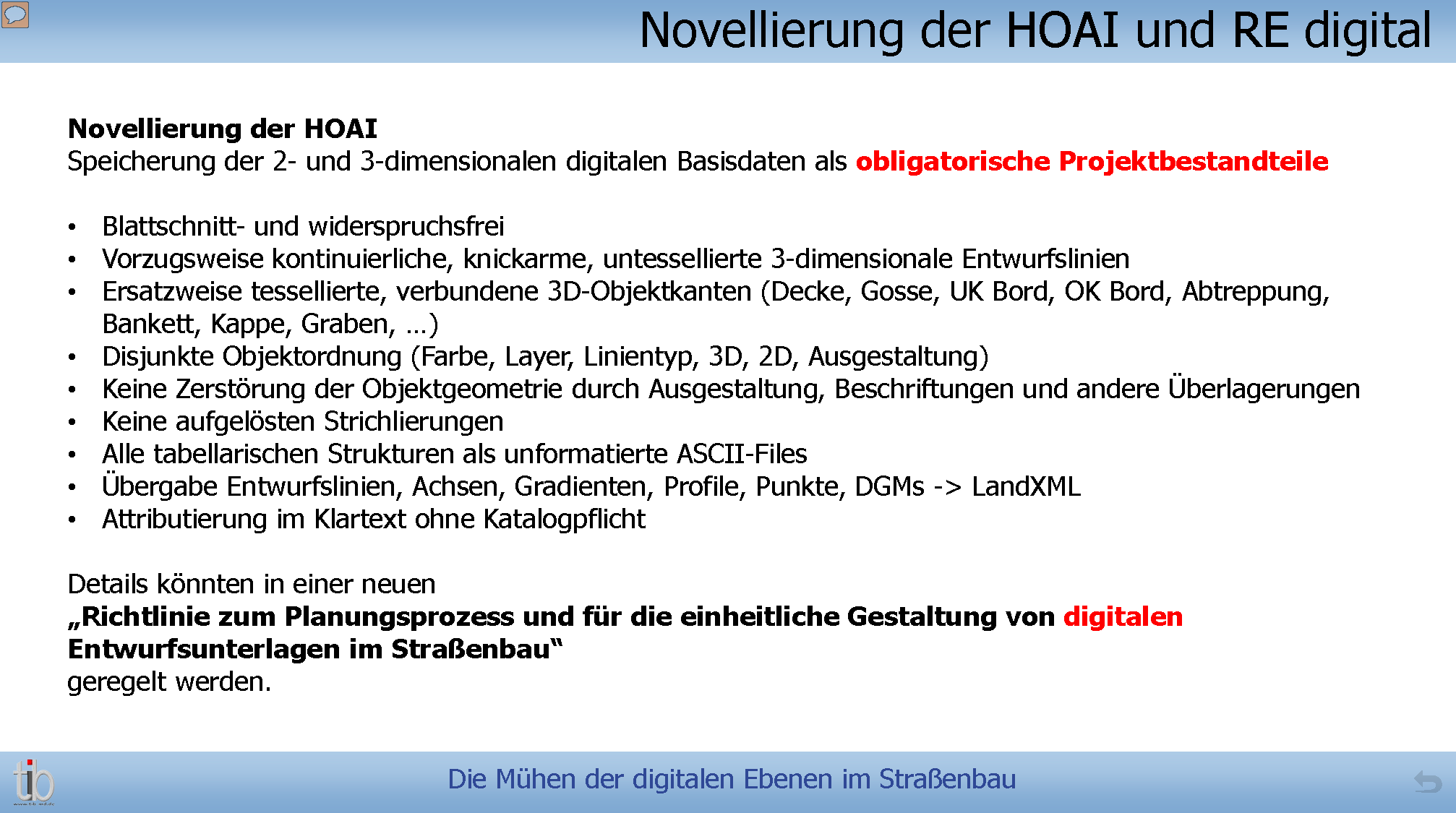 Nach den Vorgaben der RE 2012 hergestellte grafischen Planungsunterlagen strahlen als PDF und Papier vor Schönheit. Die digitalen CAD-Quellen sind oft inkonsistent, widersprüchlich, redundant, unübersichtlich in einer großen Variationsbreite. Dafür gibt es keine Regeln. Den Mehraufwand für die Herstellung verwendbarer digitaler Planungsunterlagen trägt allein der Nachnutzer, der Auftragnehmer, der Subunternehmer. Das kostet Zeit, Nerven, Geld. Ein Minimum an nachvollziehbaren Regeln könnte helfen, die Nachnutzbarkeit der digitalen Quellen zu qualifizieren. Diese Regeln könnten die geltende RE 2012 und künftige ergänzen z.B. als "RE digital".