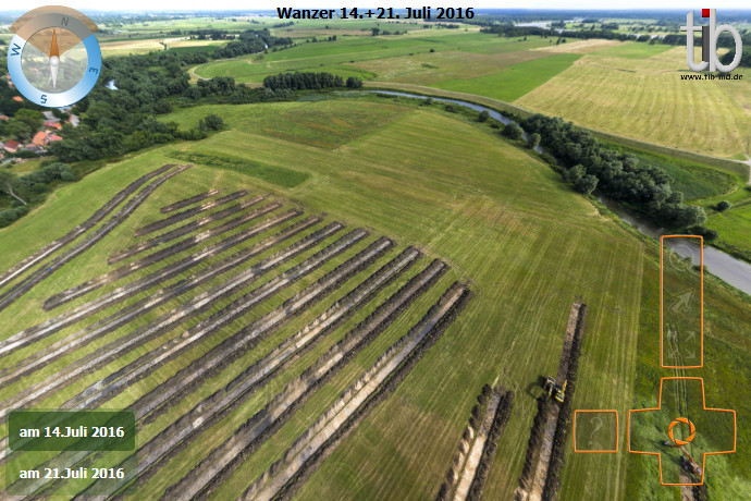 Hier sind zwei Flüge vereinigt. Ein Flug vom 14. Juli, als (fast) alle Suchgräben offen sind und ein Flug vom 21.Juli, nachdem alles verfüllt ist