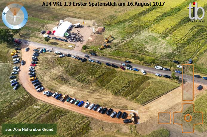 Am 16.August 2017 versammelte sich die Prominenz an der K1178 kurz vor deren Einmündung in die B189, um den ersten Spatenstich an der neuen Verkehrseinheit 1.3 der A14 zu zelebrieren. Meine Aufgabe für die VIP war es unter anderem, diesen Festakt mit einem Flug und einigen Fotos zu dokumentieren.