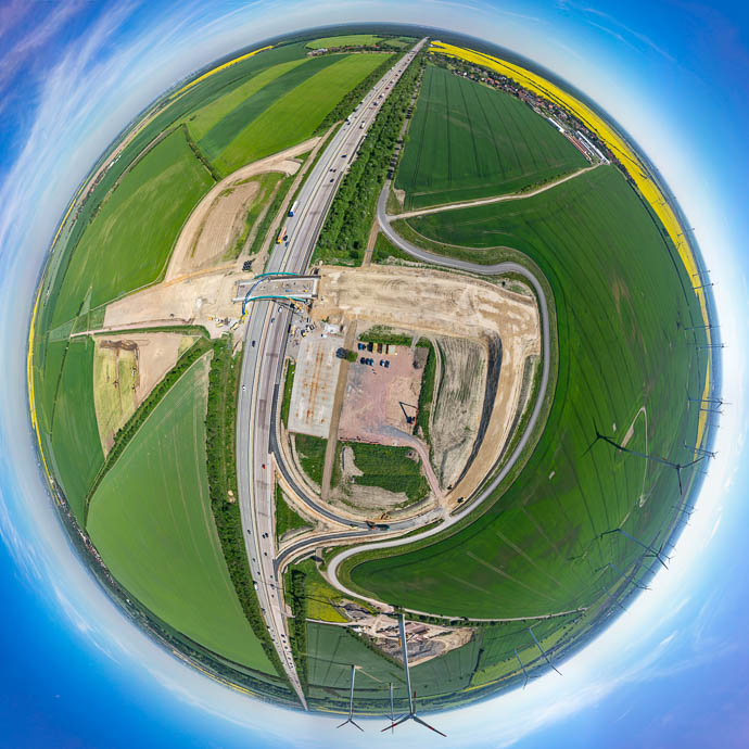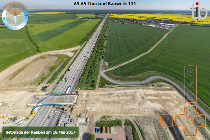 Unser erster von 3 Flügen am 18.Mai 2017. Hier schließt die B6 an ihrem östlichsten Punkt an die A9 an. Das Bauwerk 121 überführt die B6. Geflogen wurde für die VIP Ingenieurgesellschaft mbH, die den Auftrag für die Bauoberleitung der Brücke hat. An dieser Stelle der Hinweis auf den Einschub des Bauwerks, der ebenfalls auf dieser Website von mir dokumentiert ist.