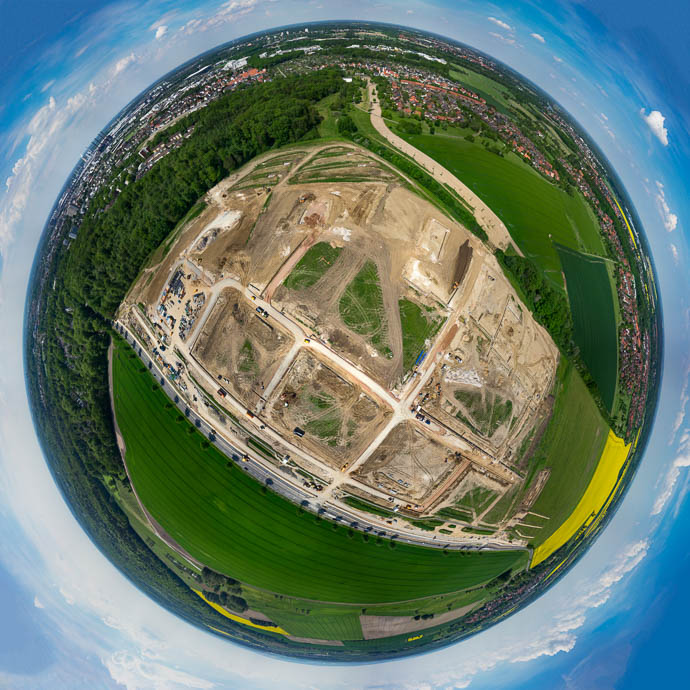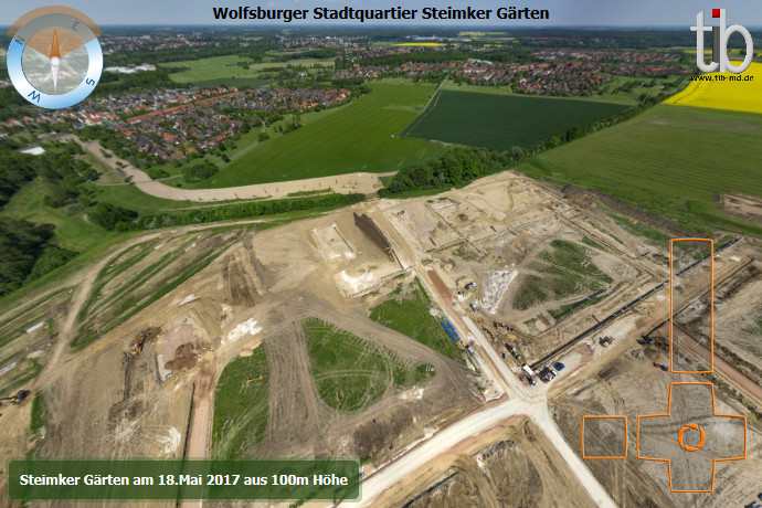 VW Immobilien lässt inzwischen seit dem 28.Mai 2017 selbst fliegen und publiziert die Panoramen auf der Website steimkergaerten.de. Da hier auch mit Auflösungspyramiden gearbeitet wird, dauert es, bis die höchste Auflösung im iframe zu sehen ist. Bei Darstellung in einem eigenen Browser-Fenster läuft der Aufbau schneller. Inzwischen ist der Flug vom 19.Oktober im Netz.