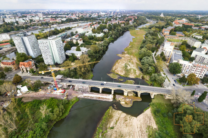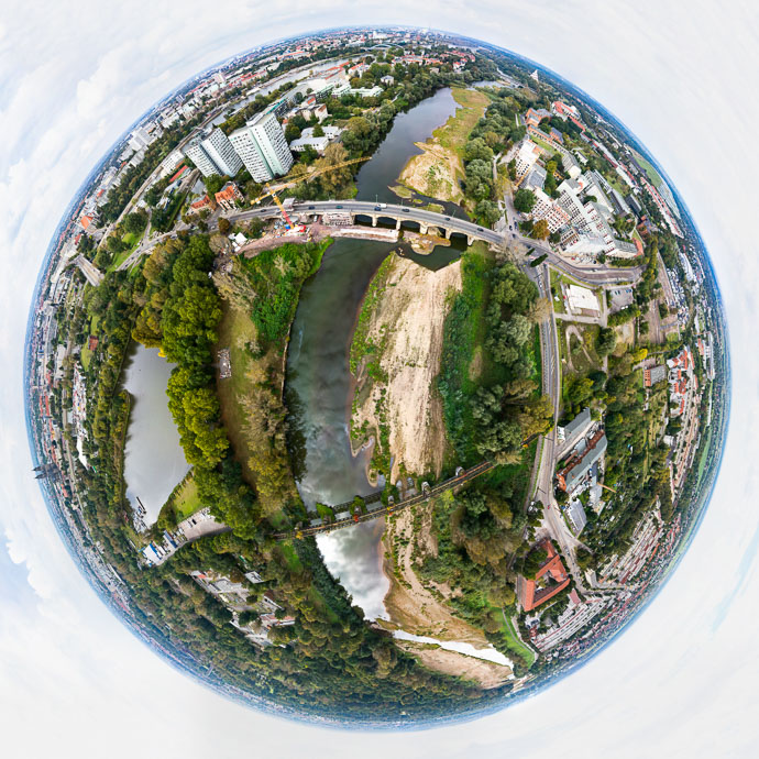 Vom Wartungsdamm an der Anna-Ebert-Brücke gestartet und bis in die Mitte zwischen Kanonenbahnbrücke und Anna-Ebert-Brücke geflogen. In 90m Höhe 86 Aufnahmen gemacht und am Abend zum Rundum-Panorama veredelt.