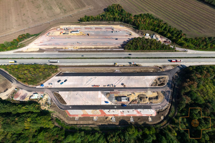 Inventurflug oder auch Bautenstandsfeststellung im Auftrage der Bauüberwachung. Die PWC-Anlage wird zur Gewinnung von Lkw-Stellplätzen großräumig umgebaut.