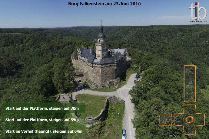 Der Flug vom engen Burghof war ziemlich anspruchsvoll, weil der Wind bei Start und Landung unberechenbar und der GPS-Empfang schlecht war.