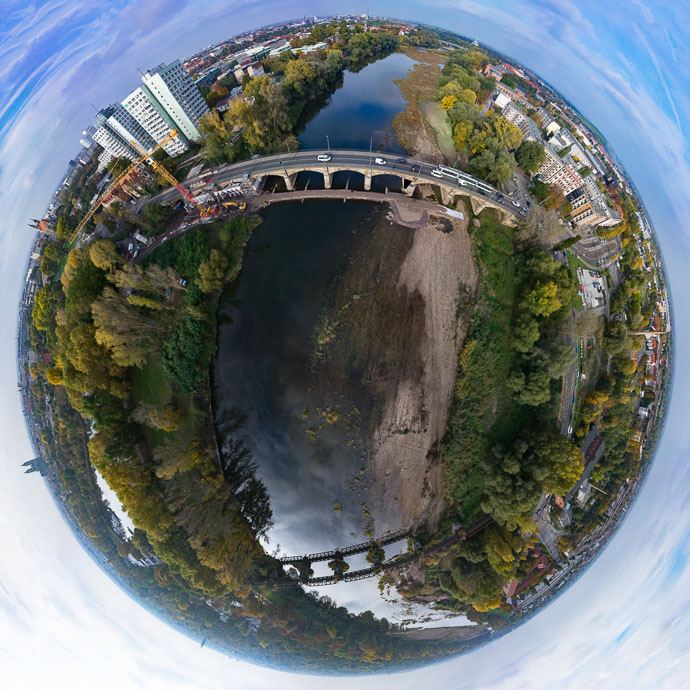 Diesen Flug habe ich lange nicht veröffentlicht, weil der Kran an der Anna-Ebert-Brücke beim Stitchen Probleme bereitete. Der Falcon war ohnehin etwas unruhig in der Luft und der Kran schwankte. Das Stitching war aus diesem Grunde nicht ohne sichtbare Artefakte möglich. Jedes einzelne der 86 Luftbilder ist natürlich trotzdem technisch perfekt und ohne Einschränkungen nutzbar. Kleinere Panoramen habe ich auch mit zufrieden stellender Qualität hergestellt. Es müssen ja nicht immer 360° sein ...