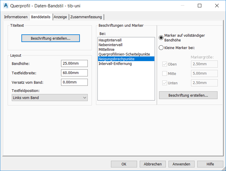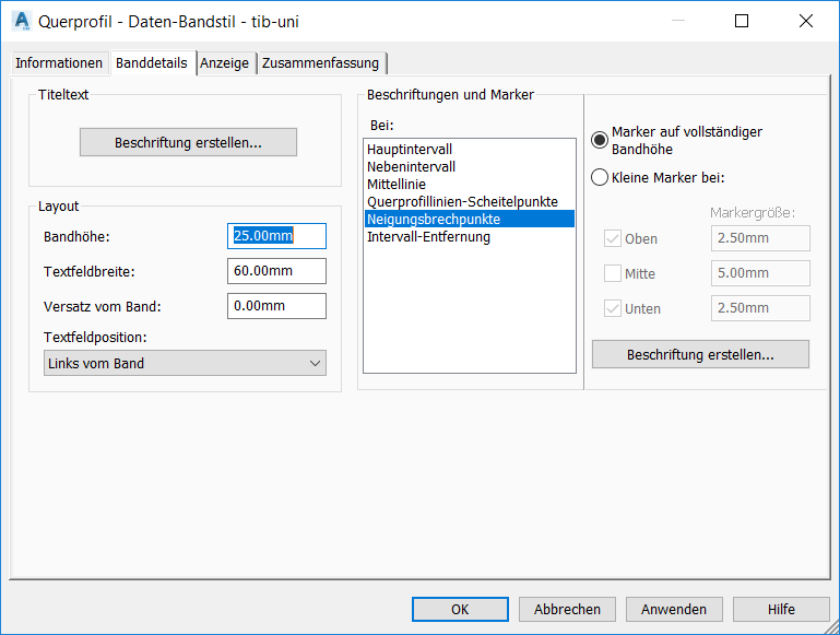 Ich gehe jetzt wieder vom noch geöffneten und aktuellen Fenster Querprofil - Daten-Bandstil - tib-uni aus und klicke im Kästchen Beschriftungen und Marker bei Neigungsbrechpunkten die Schaltfläche Beschriftung erstellen... .