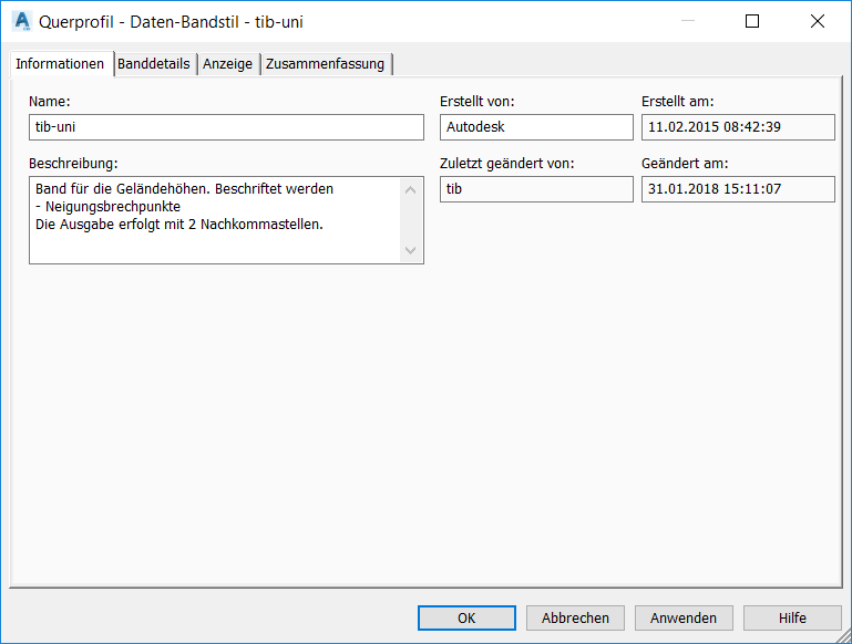 Das Datenband erhält einen von den Profildaten abhängigen Namen und könnte somit als alleiniger Bandstil für (fast) alle Längsschnitte in einem Profilplan verwendet werden. Der Inhalt wird durch den Bezugshorizont automatisch aktualisiert
