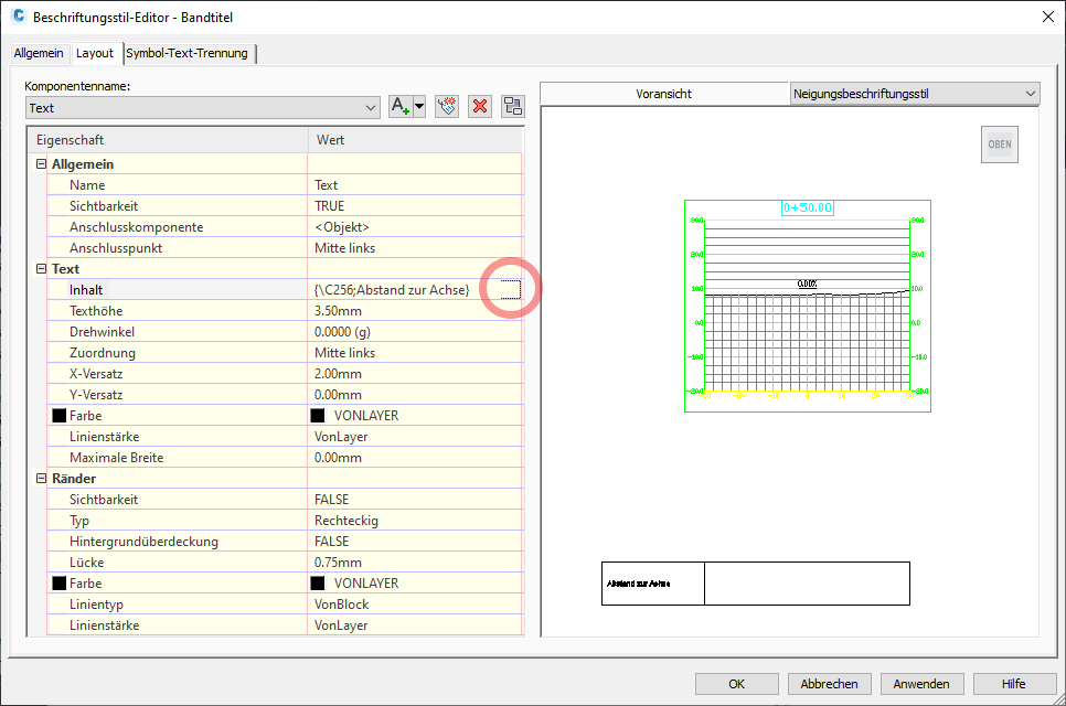 Dort klicke ich für den Komponentennamen Text in der Eigenschaft Text auf das Kästchen mit den 3 Punkten im Wert des Feldes Inhalt, in dem jetzt noch der feste Text "Abstand zur Achse" steht.