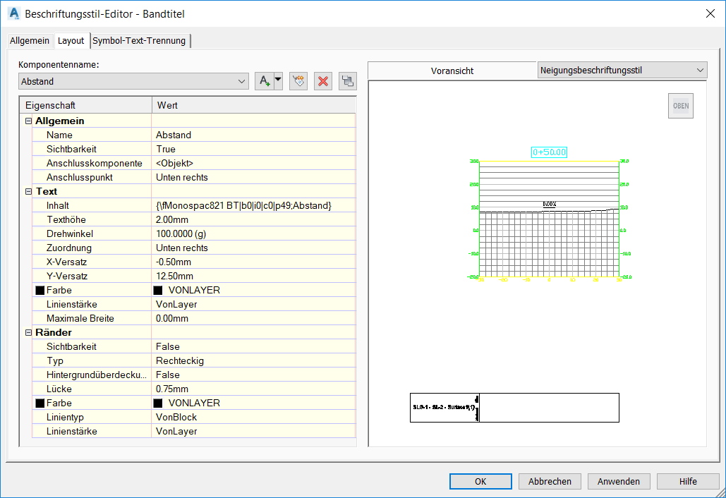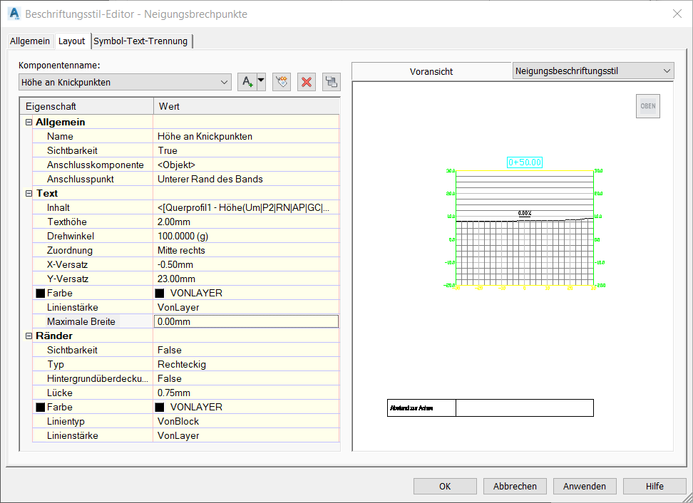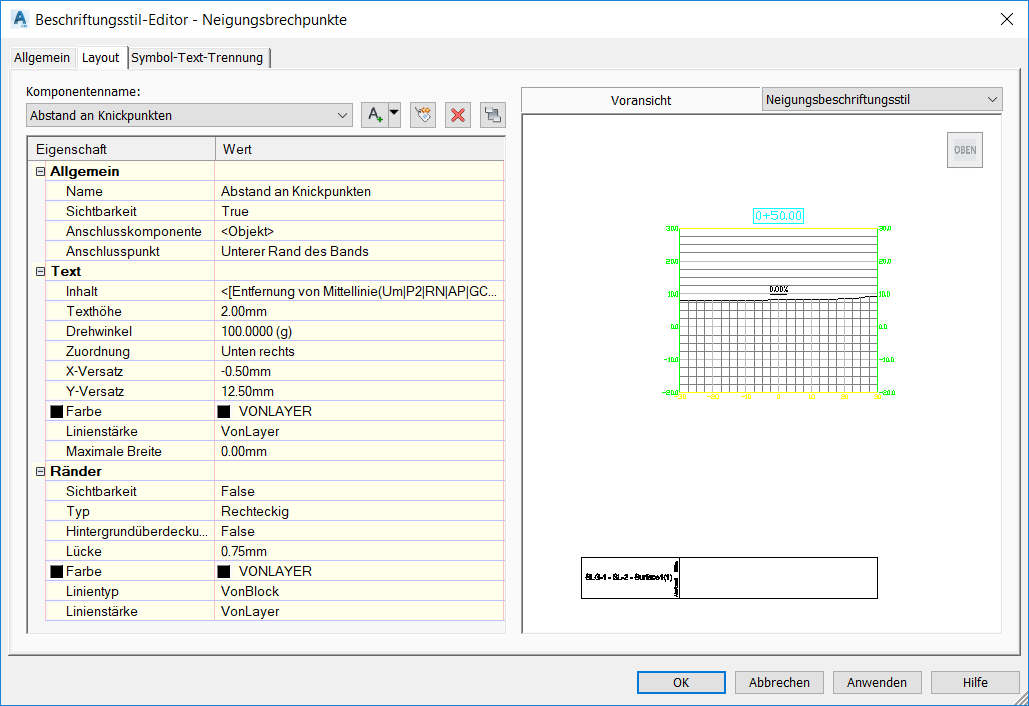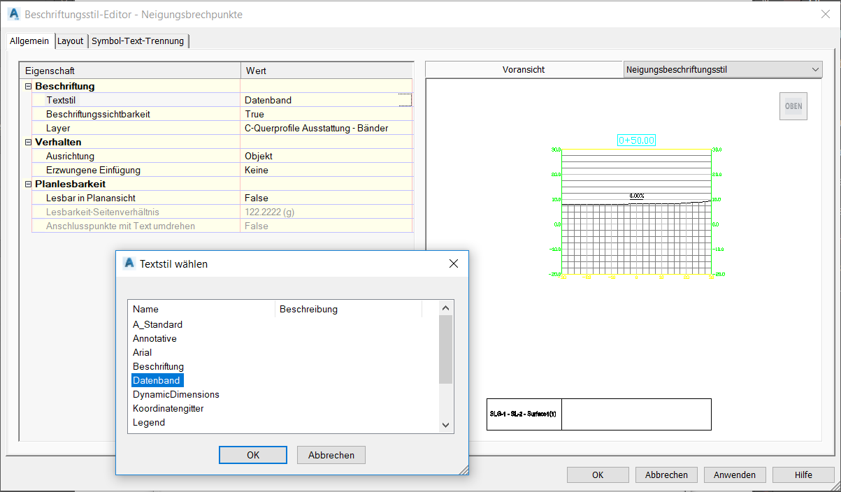 Es öffnet sich wiederum das Fenster des Beschriftungsstil-Editors, aber diesmal für die Neigungsbrechpunkte. Hier lege ich im Reiter "Allgemein" für die Beschriftung den Textstil "Datenband" fest.