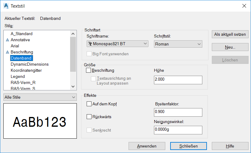 In Texten, die denen die Position der Zeichen in Relation zu benachbarten Texten eine Rolle spielt, ist eine Schrift mit fester Zeichengröße zu empfehlen. Da es sich bei den Datenbändern eigentlich um gedrehte Tabellen handelt, kann man durch die Verwendung eines "Fixed Fonts" oder "Monospace" Schriftart die Orientierung verbessern. Eine alte Windows-Schriftart ist zum Beispiel die Courier. Eine modernerer Fixed Font ist die "Monospac 821 BT", die auf fast jedem Windows-Rechner zu finden ist. Diese Schrift benutze ich als Basis für einen eigenen Stil, den ich unter dem Namen "Datenband" speichere.