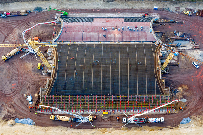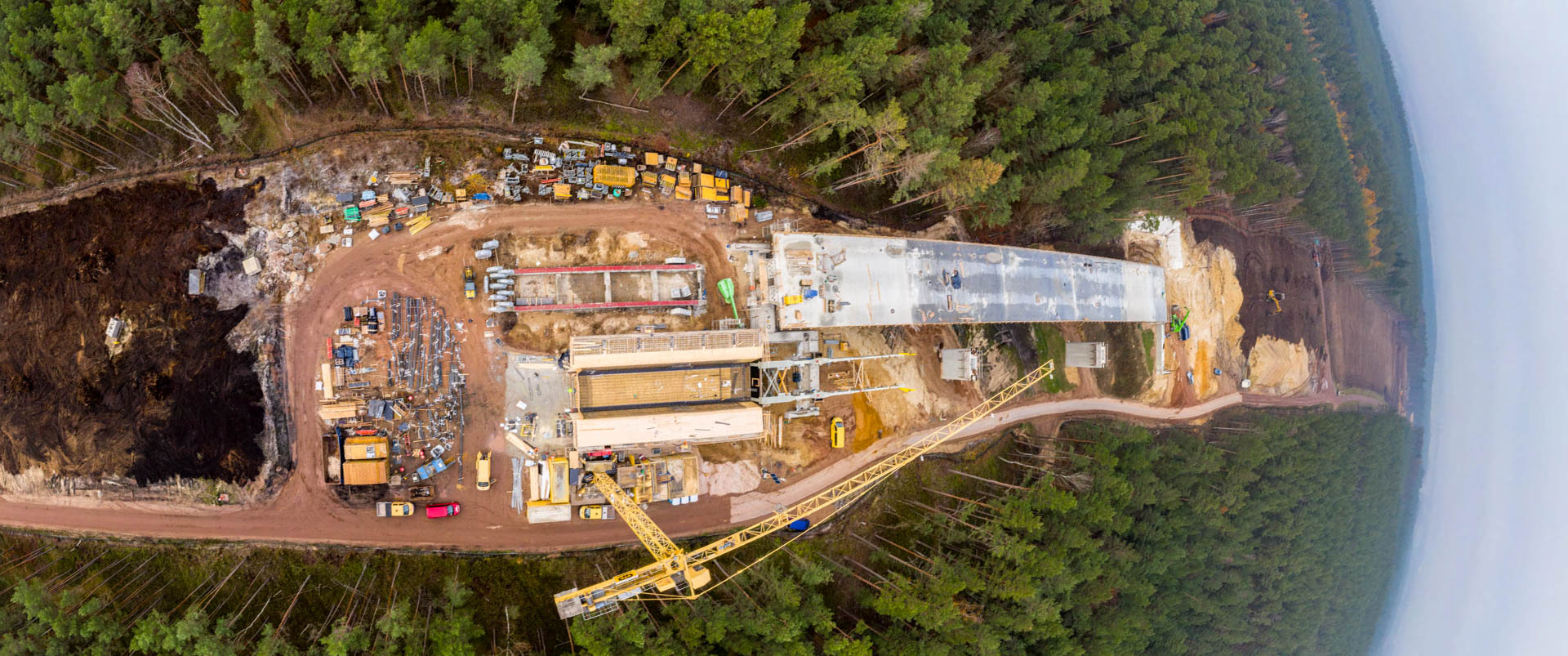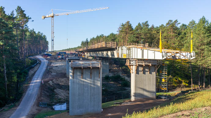 Die Brücke über den Kuhgrund besteht aus 2 separaten Überbauten für die Richtungsfahrbahnen Magdeburg und Schwerin. Jeder Überbau wird in 5 Takten vorgefertigt, die dann über das kleine Tal verschoben werden. Die Schalung ist immer die gleiche, sodass nach dem Verschub ein neuer Takt bewehrt und betoniert werden kann.