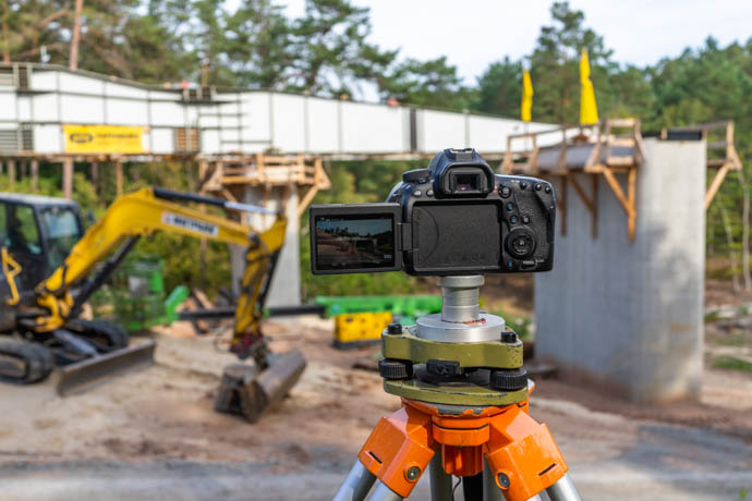 Seit Juli 2020 begleitete ich den Verschub der Takte des Überbaus der Brücke mit Zeitrafferaufnahmen. Dabei wurden bis zu drei Vollformatkameras an unterschiedlichen Stellen positioniert, die den Verlauf der Verschiebetakte gut abbilden konnten. Genutzt wurde bei allen Kameras die integrierte Zeitrafferfunktion. Meist wurde ein Intervall von 6 Sekunden genutzt, sodass 1 Sekunde Film mit 25 Bildern einer Realzeit 2,5 Minuten entspricht. Aufgezeichnet wurde in 4K, zu YouTube hochgeladen in Full-HD.