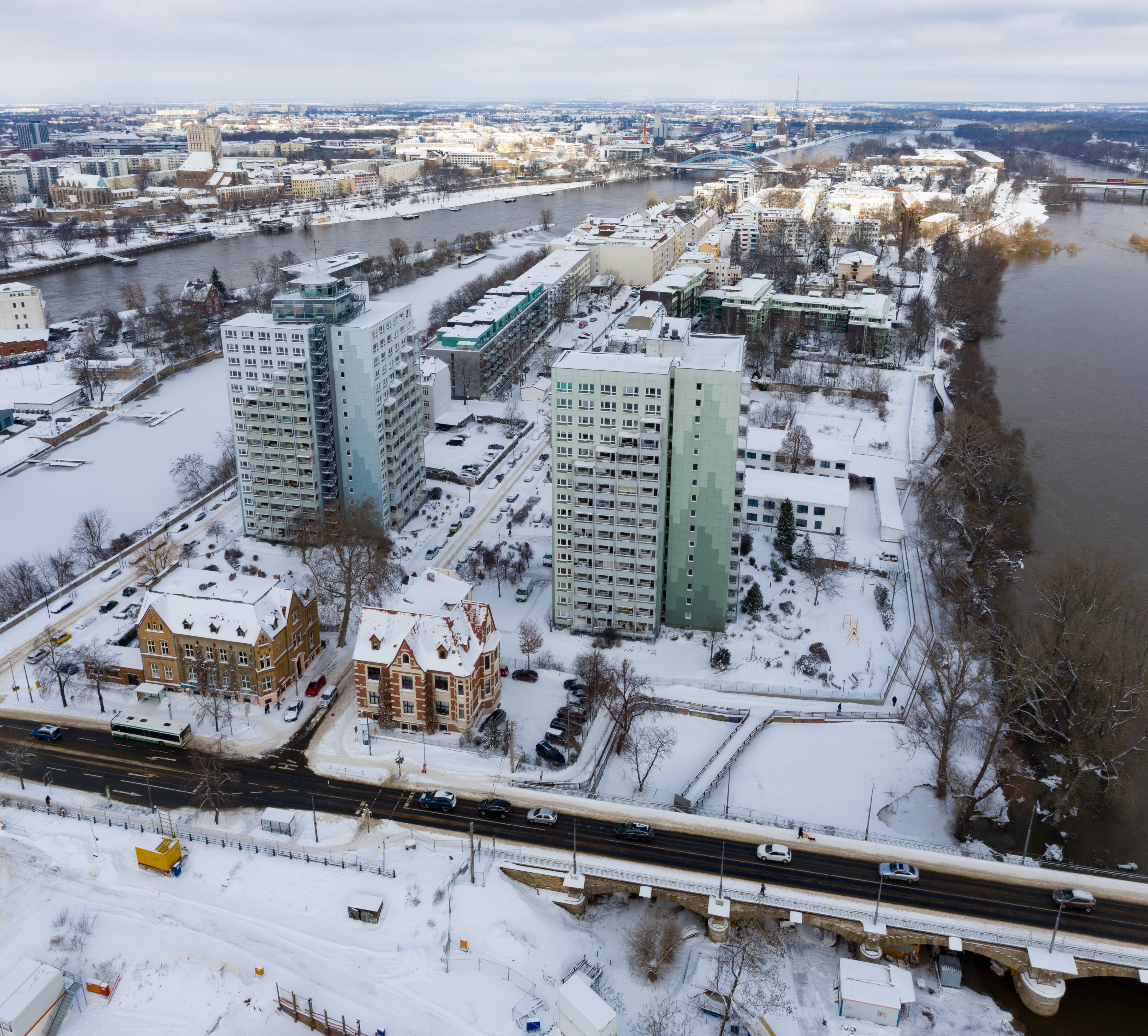 Die Experimente mit den Luftbildern von GeoFly zeigten, dass die Generierung von flachen Panoramen aus Streckenflügen möglich ist, wenn die Naht zwischen benachbarten Fotos auf dem Grund verläuft und erhabene Elemente der Szene einander nicht überlappen. Sowohl die Panoramafunktion von Lightroom als auch die äquivalente Funktion in Photoshop liefern brauchbare Ergebnisse, die aber nicht immer frei von Artefakten sind. Der Workflow ist inzwischen so, dass sowohl gerade als auch ungerade Fotos der Folge sowohl mit Lightroom als auch mit Photoshop separat „gestitcht“ werden und das Ergebnis mit den unauffälligsten Artefakten weiterverwendet wird. Eine echte Herausforderung im Baufeld des Ersatzneubaus Strombrückenzug sind oft die 16-Geschosser an der Mittelstraße. Eine Naht zwischen diesen offensichtlich aus verschiedenen Fotos stammenden Ausschnitten ist nicht zu erkennen, oder?